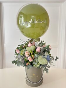 Lata 12×9 com flores rosa e branca da estação e mini balão personalizado. Entre em contato pelo nosso WhatsApp 11