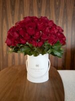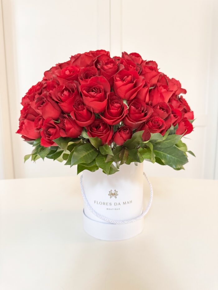 Box branco 15×18 com 100 rosas vermelhas. Altura aproximada de 44 cm de altura e 34cm de diâmetro.