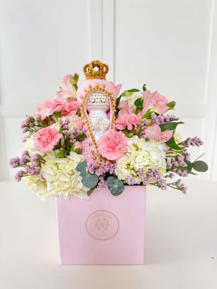 Box G 20×20 com astronauta de crochê e flores nobres.