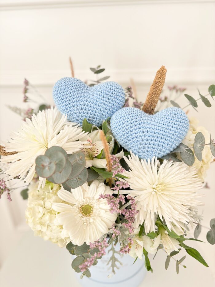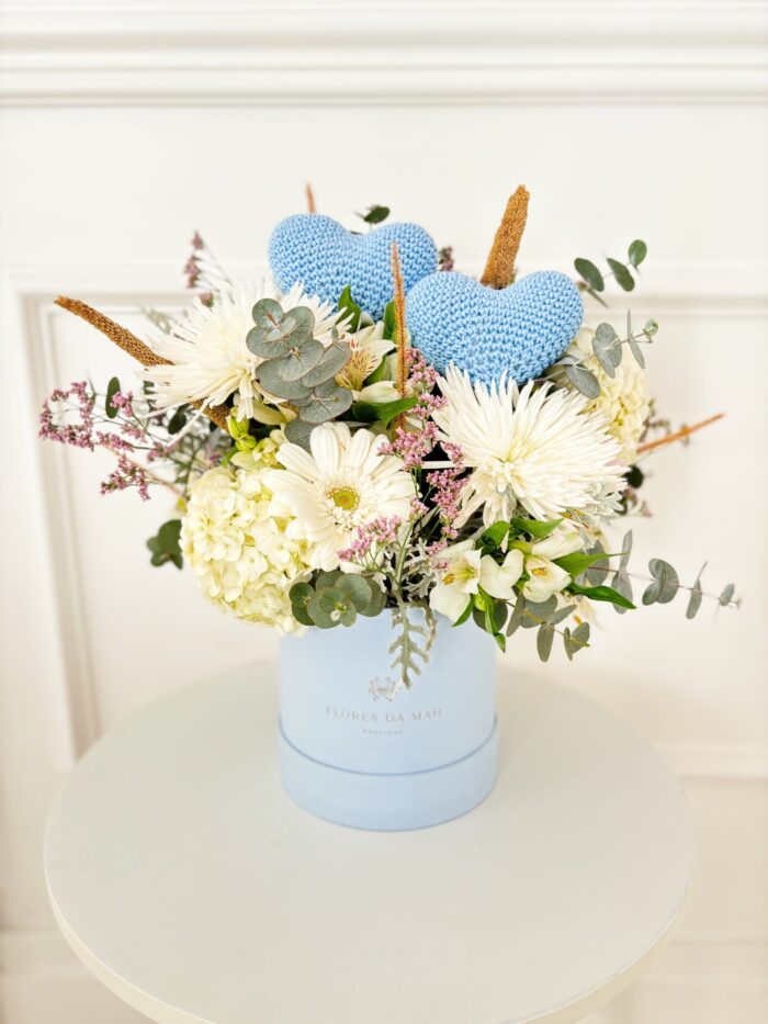Box M azul 15×15 com flores brancas da estação e dois corações de crochê.