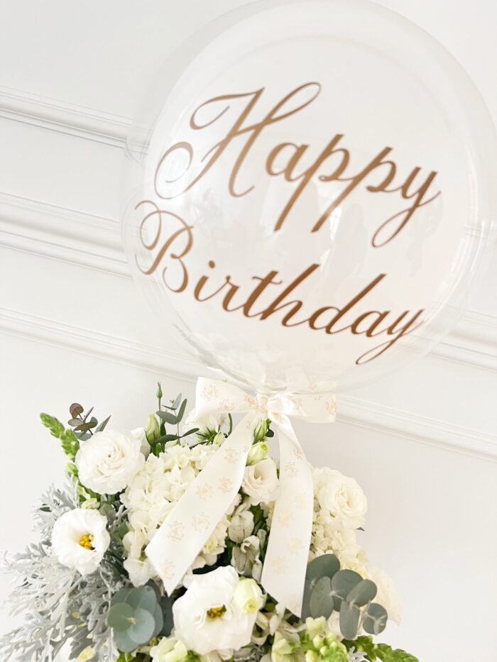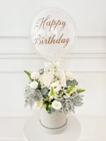 Box G 20×20 com flores brancas da estação e balão Happy Birthday.