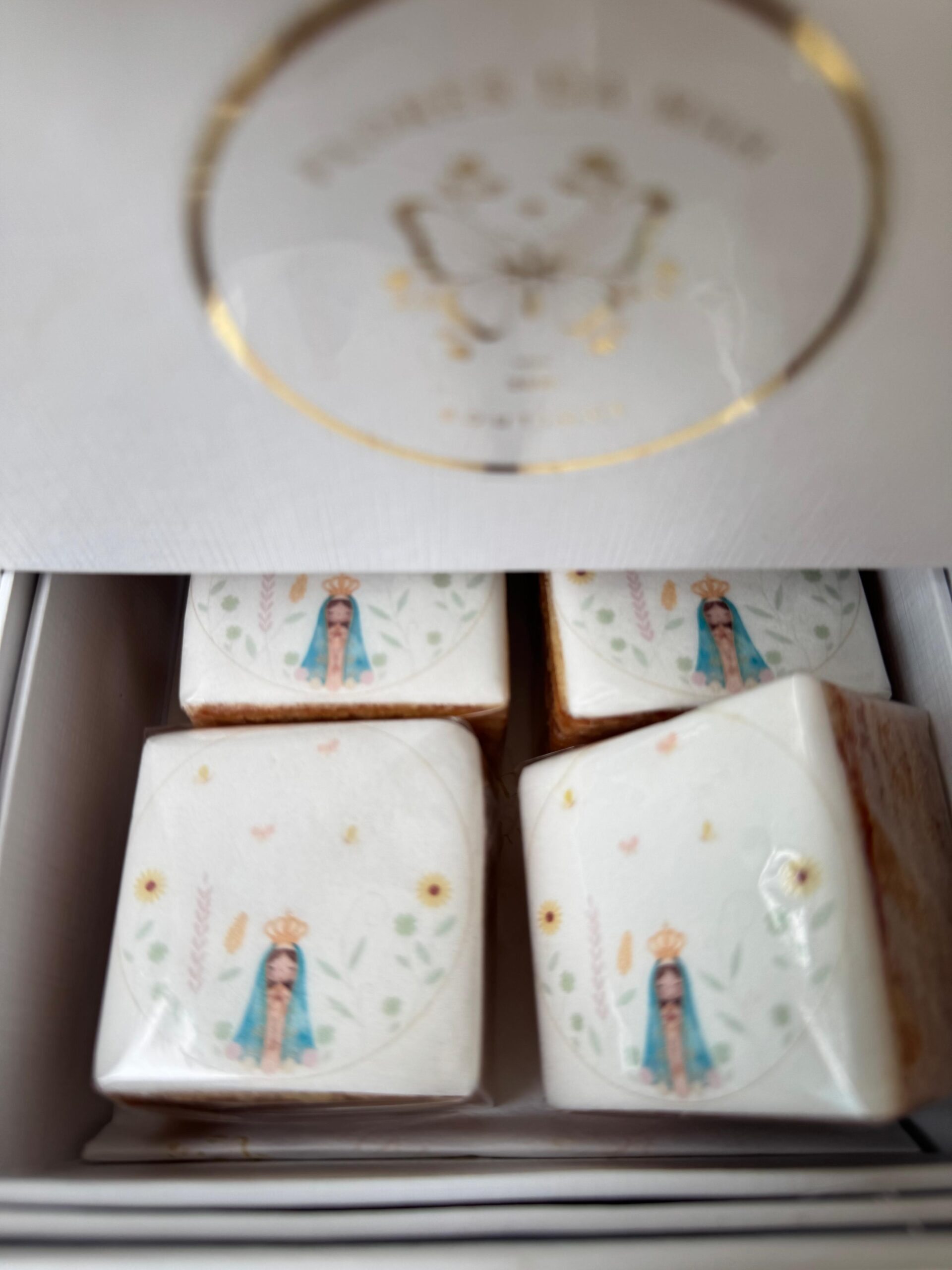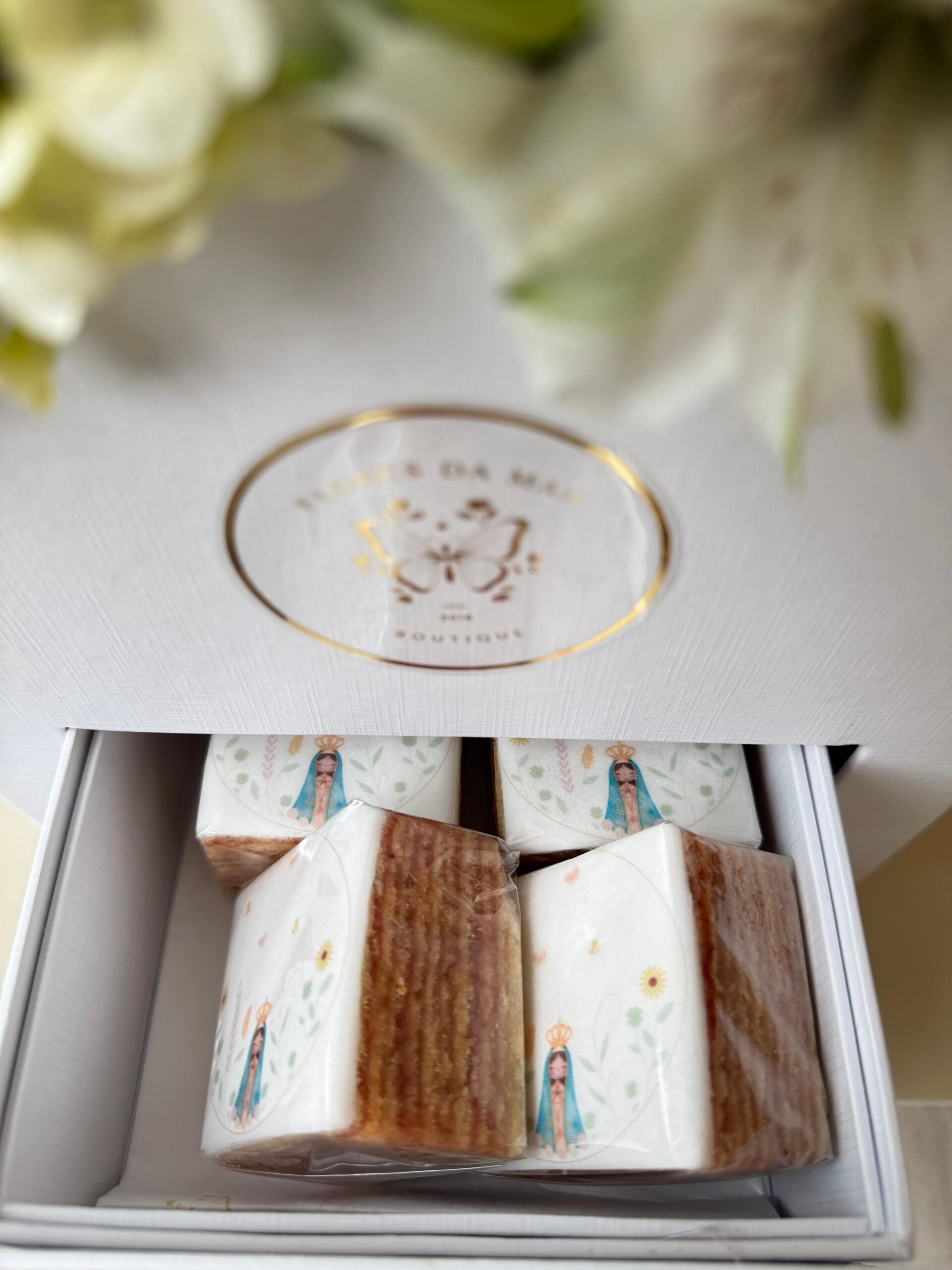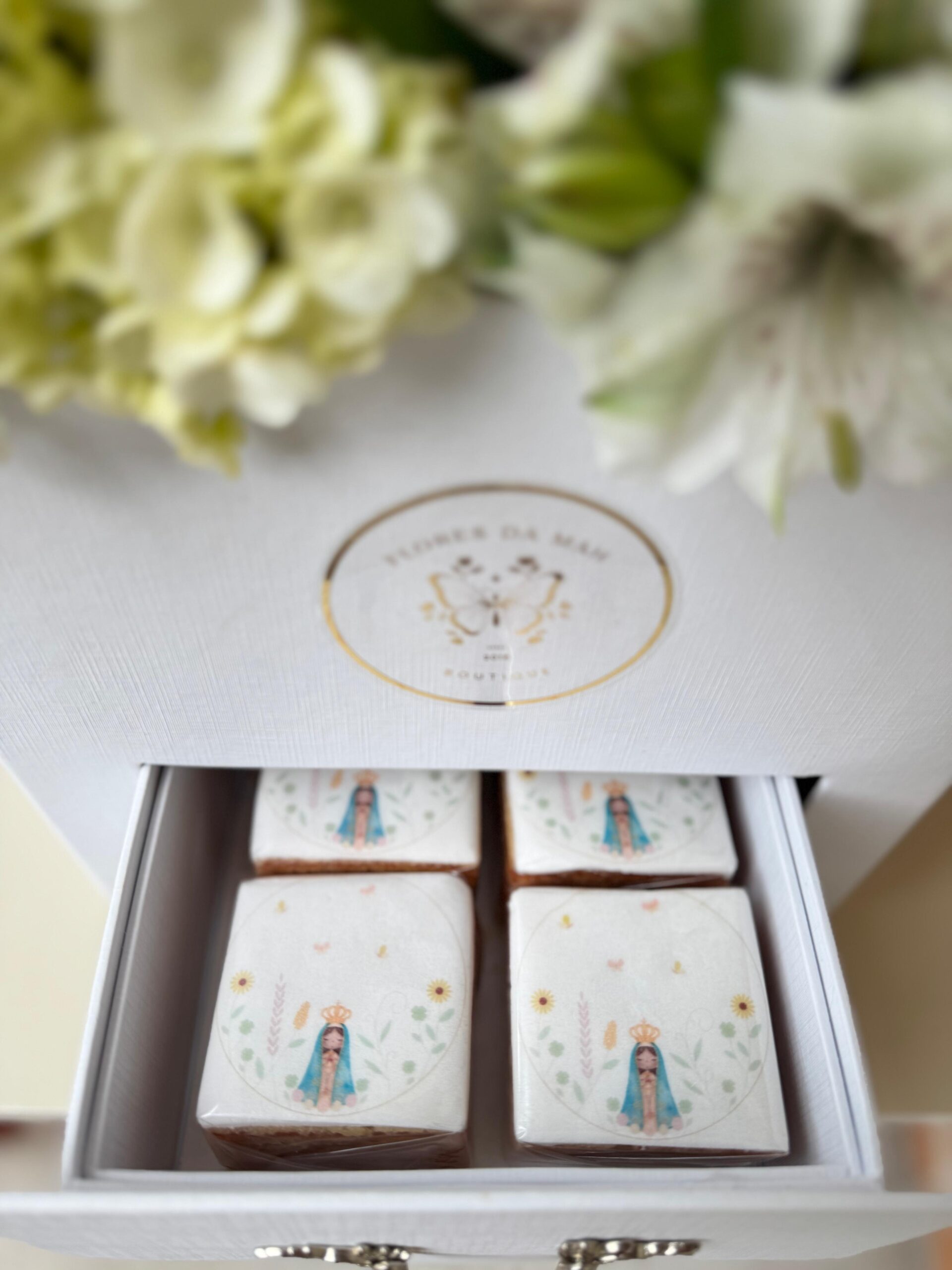 Na gaveta, uma surpresa doce: docinhos de bolo de rolo de goiabada, preparados para adoçar o coração e tornar o momento ainda mais especial.