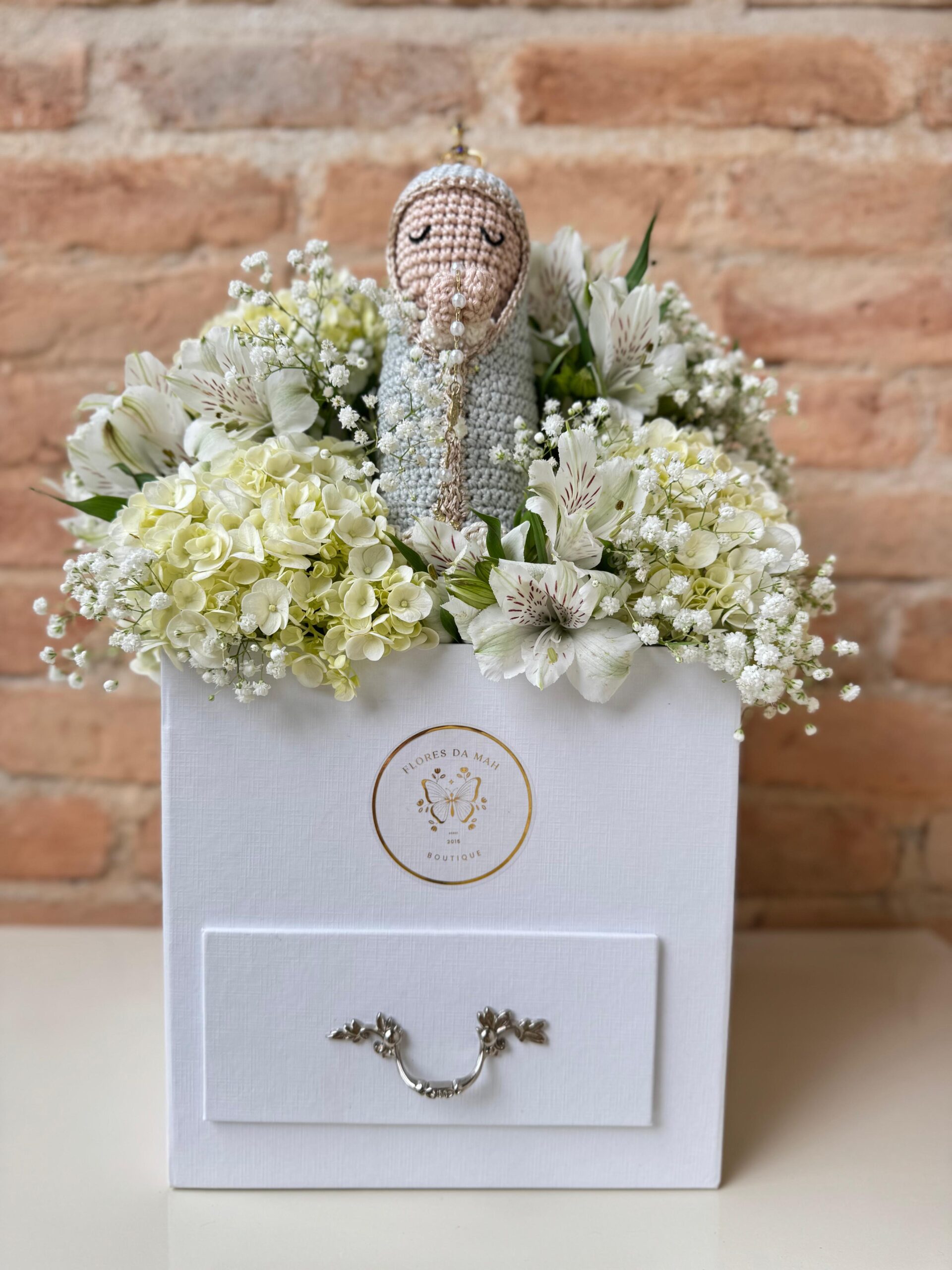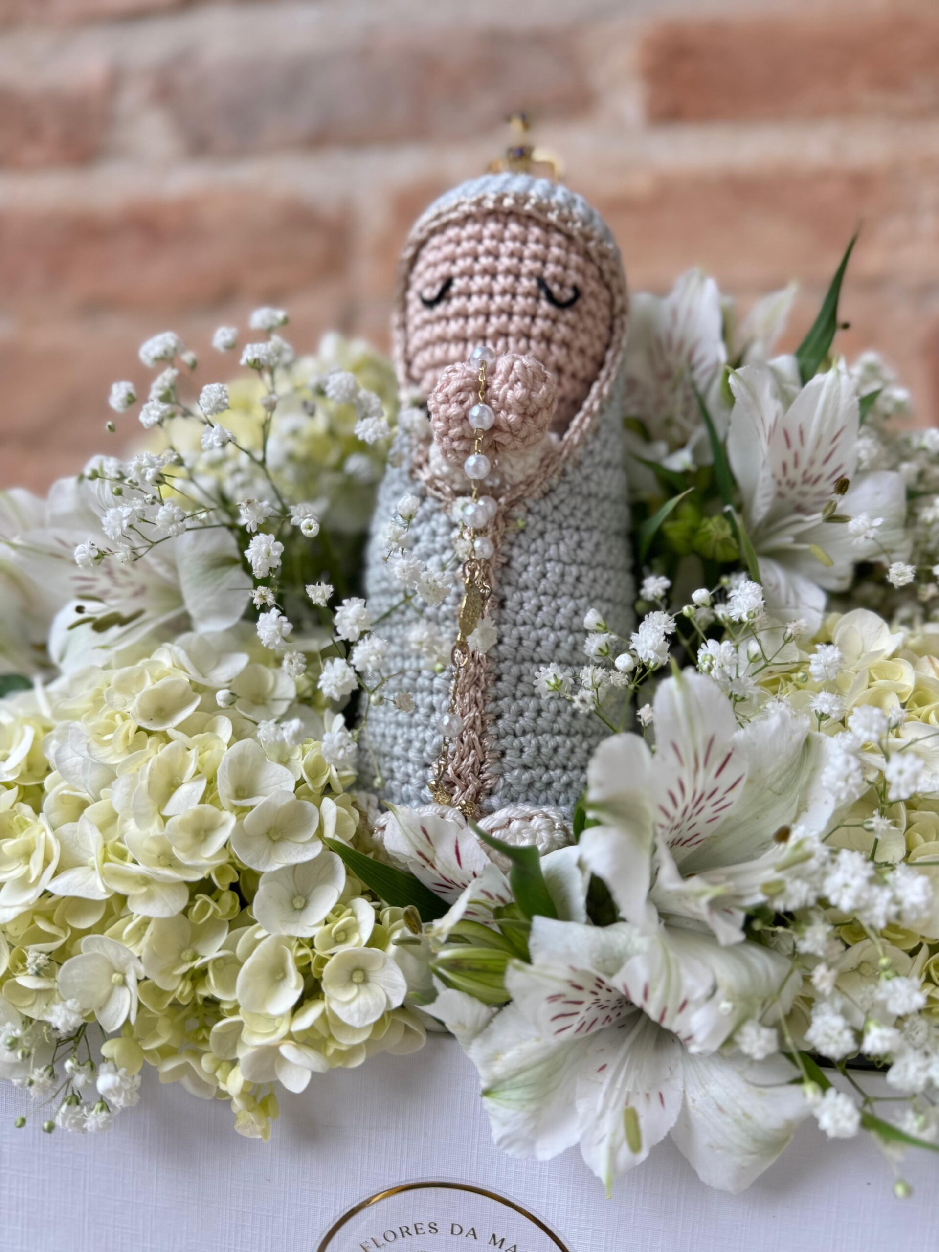 Este box especial traz Nossa Senhora em crochê artesanal, envolta por flores claras que simbolizam paz e pureza.