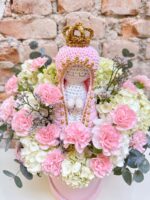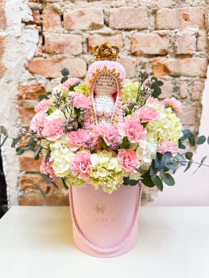 Box M 15x15cm com Nossa Senhora em crochê e flores.
