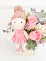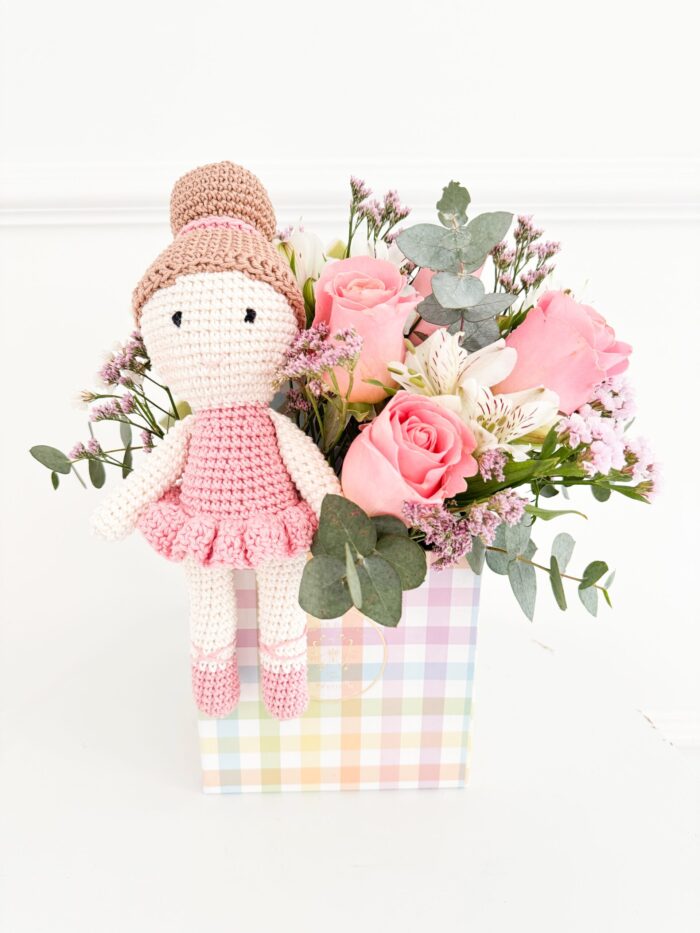 Box xadrês 15X15, com bailarina de crochê 28cm e flores rosa e branca da estação. Umpresente delicado, cheio de carinho e personalidade. Nós valorizamos muito um trabalho artesanal feito a mão.