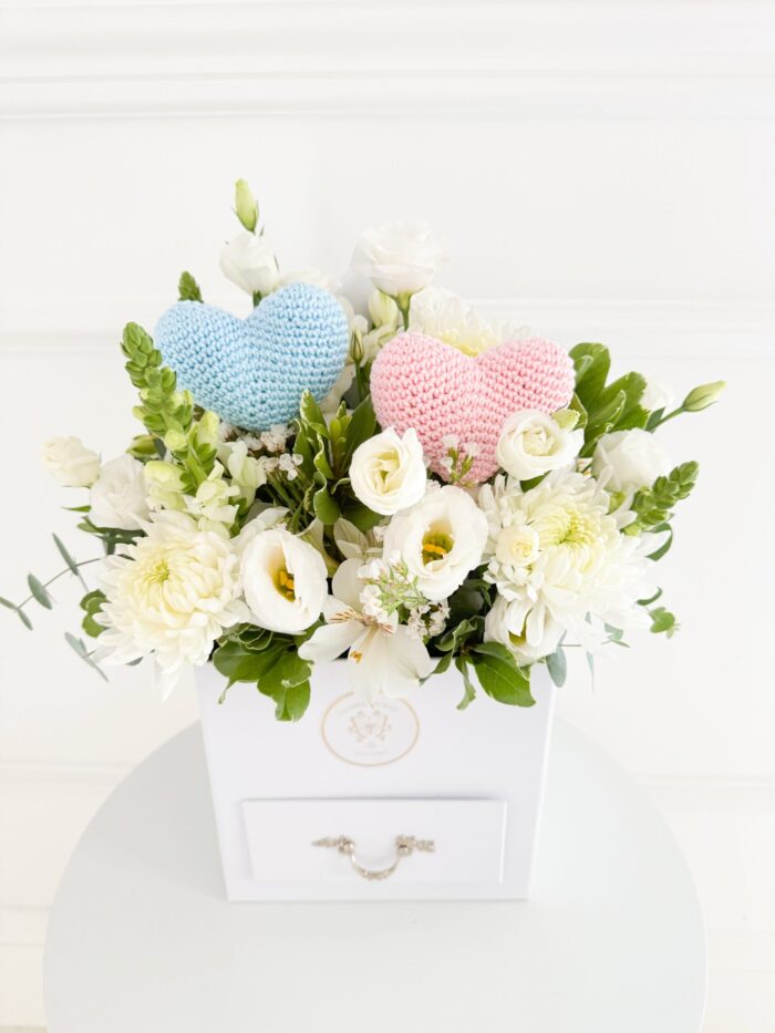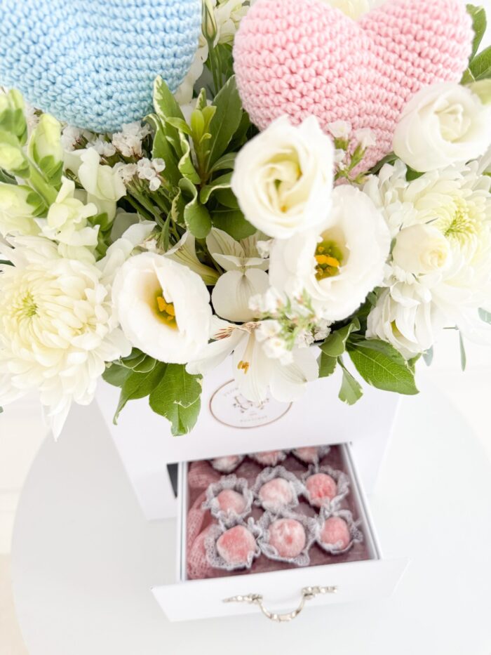 Box 20×20 com flores brancas, 2 corações em crochê. Na gavetinha 12 brigadeiros rosa ou azuis.