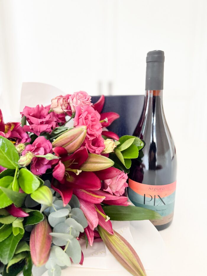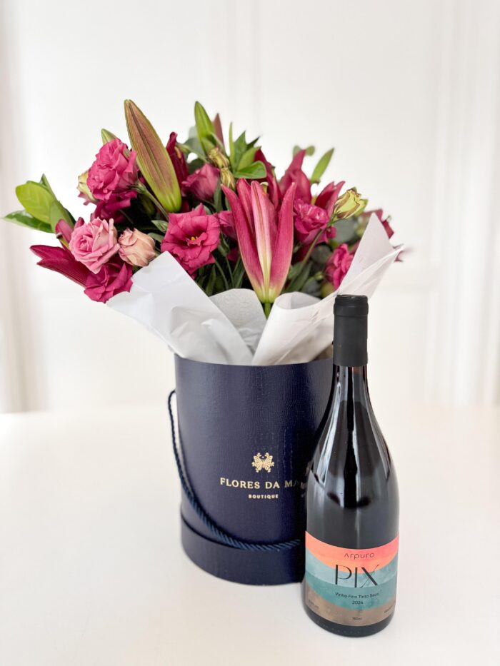 Box marinho 20×23, com uma garrafa de vinho tinto pix da vinícola Arpuro e Buquê de flores nos tons de vinho da estação.
