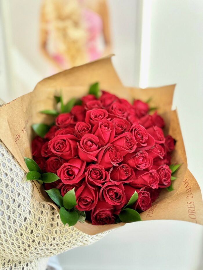Buquê com 80 rosas vermelhas.