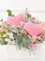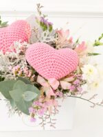 Envelope 22x12x30 com flores brancas, rosas e corações de crochê.