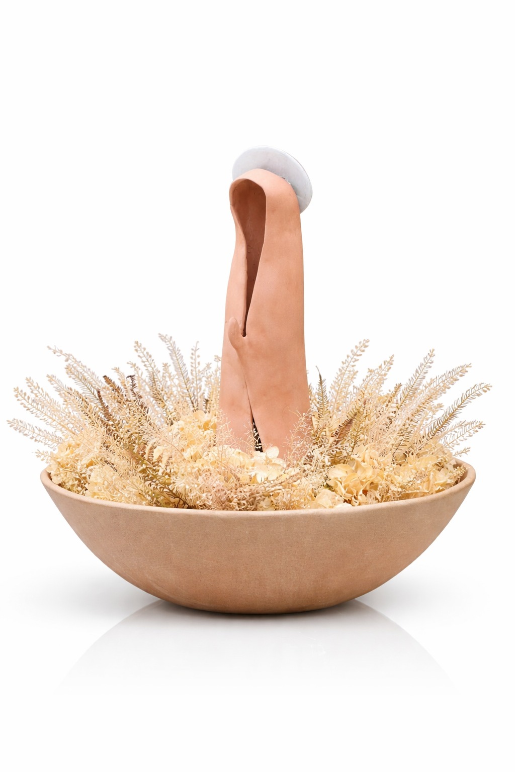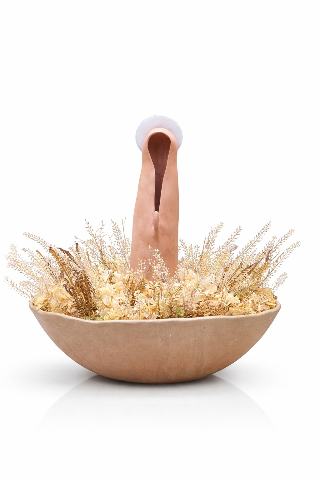 O vaso em cerâmica, com design elegante e acabamento refinado, também é produzido de forma artesanal por uma ONG que apoia mulheres em situação de vulnerabilidade, transformando arte em oportunidade e impacto social.