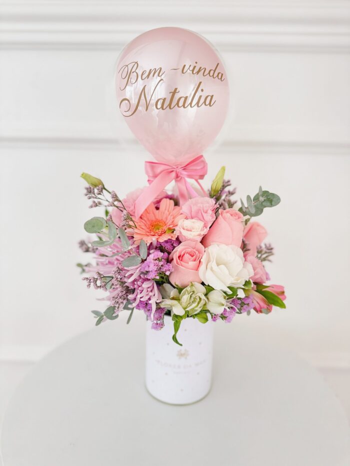 Lata 12×9 com flores rosa e branca da estação e mini balão personalizado.