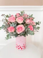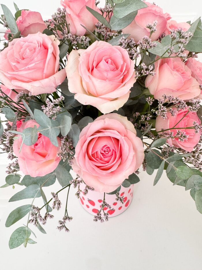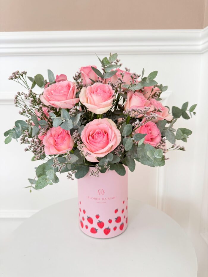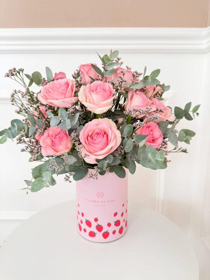 Lata rosa morangos 13×18 com 20 rosas rosa, limonios e eucaliptos.
